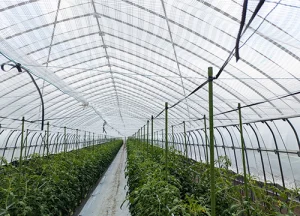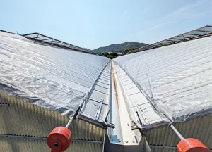 遮光ネットはハウス内の温度上昇を抑え、暑さから農作物や作業者を守る役割があります。